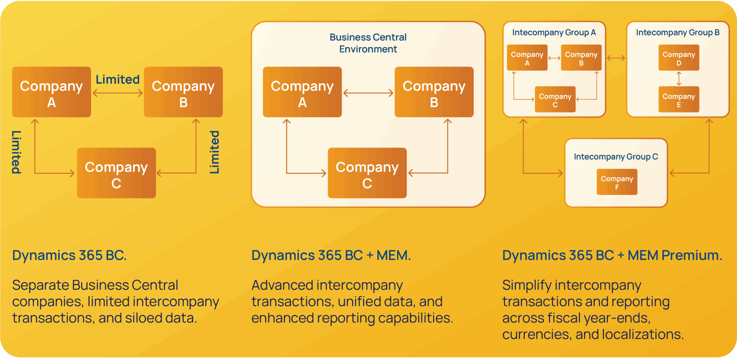 To take things even further, MEM can be combined with the Intercompany Suite (ICS) module to provide advanced reporting capability, unified data, enhanced intercompany transactions, and localizations. Combining MEM and ICS with the BC functionality allows users to: